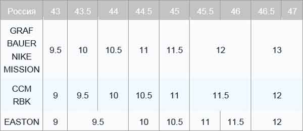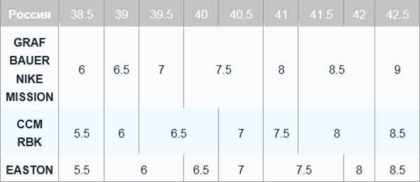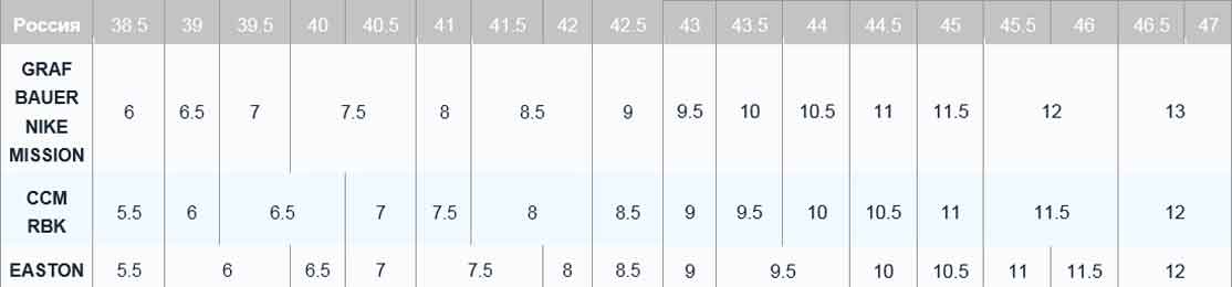 Размер хоккейных коньков, как правило, на 1 — 1,5 размера меньше размера обычной обуви. Определив размер с помощью специальной линейки, по возможности примерьте коньки на полразмера меньше, т.к. ботинок конька должен сидеть как можно плотнее.