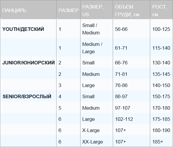 ВНИМАНИЕ: Размеры нагрудников, данные в таблице, стоит воспринимать только как рекомендации. Размеры могут отличаться в зависимости от фирмы производителя.
